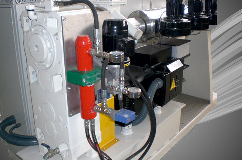 Square body gear boxes which are reinforced with heavy type impression bearings that will bear the back pressure load are used in the new technology square body extruders. The Gear-box units are helical type and are Italian or Turkish gear boxes. Depending on the type of extruder long body (for compact range) ör normal body gear boxes can be used.