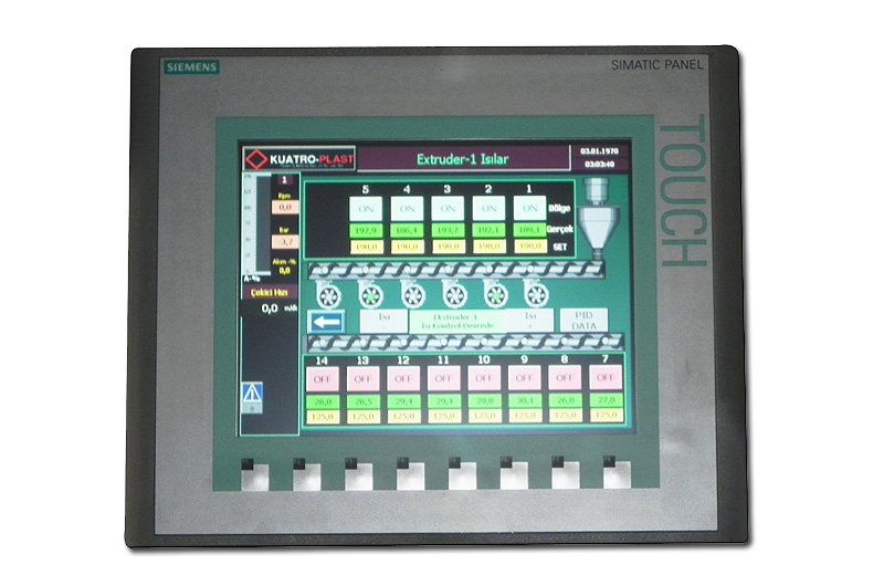 PLC control system is used in extruder automation. Many data related to extruder is submitted to the user through touch panel by being processed thanks to PLC. Many data is presented to the user with the best interfaces with the programs developed as a result of long term studies and experiences of our firm.